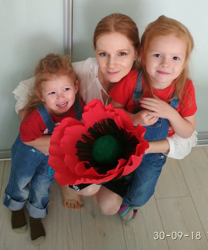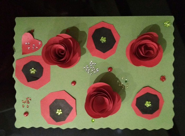 Всем доброго времени. Вот такие маки мы подарили и моей сестре и сестре мужа. Новый опыт работы с гофрированной бумагой. Делались по мк, которых очень много на ютубе. А ну и совместно с старшей дочкой сделали открытку, главная просьба ребёнка "побольше блесток !!!"...