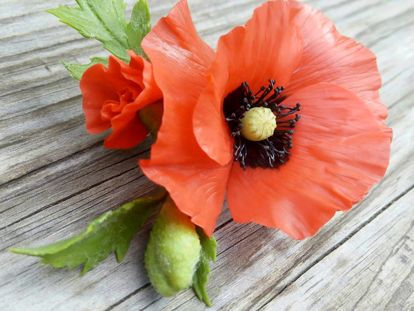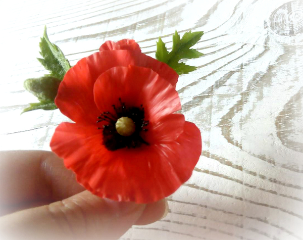Небольшая заколка(зажим)с цветком,бутонами и листиками мака с дополнительным креплением для ношения украшения как брошь.Материал полимерная глина.Тычинки ручной работы,тонировка маслом художественным.Очень легкое изделия.Размер цветка 5 см.в диаметре.