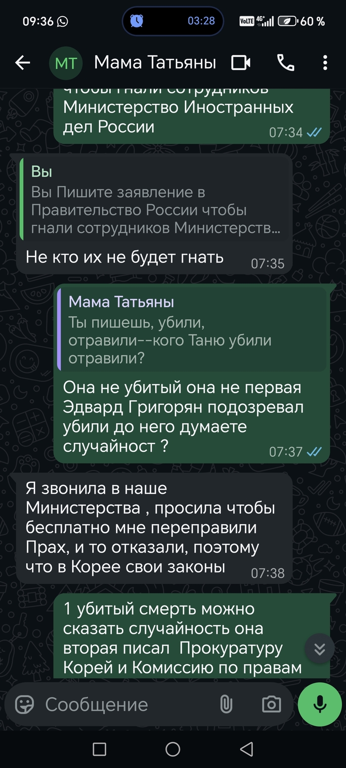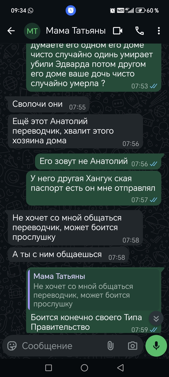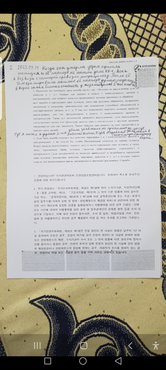 Я написал заявление в Правительство Корей чтобы мне возместили 2 человека убили так меня взяли идеялные заложники за это моральный ущерб 5000000 миллионов доллара. Южная Корея 2 дома я думаю 2 человека убили. Первого убитого друга Эдварда Григоряна я подозревал убили. Мою девушку Россиянку Татьяну Ардешвили я думаю со второго раза убили 1 раз не умерла покушением. Говорила когда я ухожу на работу хозяин дома открывает дверь чип ключем и не уходит. Её мама Россиянка говорила хозяин дома моей девушке предлогали стать её любовницей. И ещё у неё был таксист она дала ему кличку злобный она говорила до её смерти он приходил кто из сделал не понятно. Телефоны внутренного рынка Корей скрытым удалённым управлением включён" отключите это для собирание информации о структурах шпионаж не докажете. Эти телефоны Корей удалённым управлением по всему миру. Я думаю какой-то структура Корей подозреваю скрытым удалённым управлением собирали информацию провинивщихся так думаю скрыто я думаю подстройили убивали. День её смерти из арендованный комнаты Корее пропадает её паспорт думаю подстроили потом я думаю квартиру подкинули паспорт обратно. Разбирался писал Прокуратуру Корей и Комиссию по правам человека в Республике Корей отписались сокритием специально написали мою имю и фамилию через английскую букву R. Я писал Президенту России и Правительство России чтобы дали команду Министерство Иностранных дел России чтобы превлекли ответственности Хангуков Южно Корейцев почувствовали обсалютную безнаказанность не принимали меры... Правительство России написали не могут помочь. 1 содрудник миграционный полиции Корей менеджер не отдовал телефон говорить где-то до 4 месяца<< написал заявление комиссию по правам человека в Республике Корей отписались не принимали меры. 5 сотрудники миграционный полиции Корей тянули через за наручники привышением своего полномочия на моём остался руке остался глубокие следы и поранили ногу. Я на видео снял их конце 1 содрудник миграционный или сотрудник аэропорта напал на меня прижав меня к стене ладонью душил и хватался за телефон" у меня на руке были документы От Комиссии по правам человека в Республике Корей.