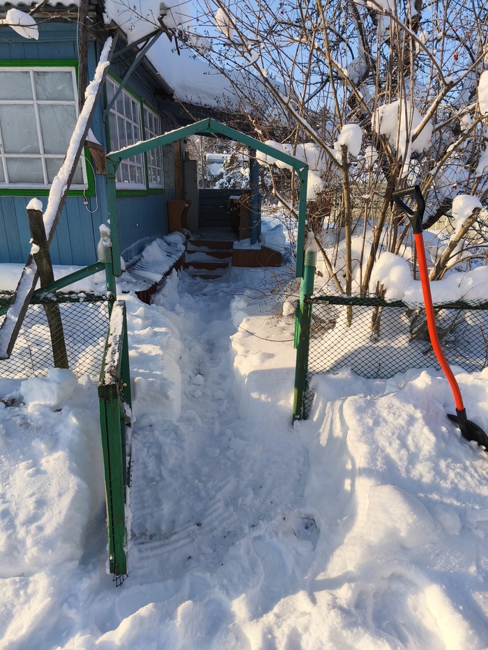 В общем-то, и на этих выходных столбик термометра показывал −26 °C, но я таки выбрался на дачу хотя бы для того, чтобы почистить дорожки от снега.
