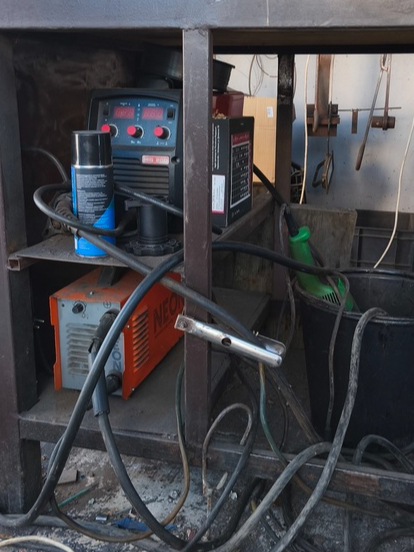 Также в кузнице стоит небольшой сварочный стол, на котором сосед сделал немало изделий — как для своего участка, так и для всего нашего СНТ. Возможно, столу не хватает модной перфорации, но это мелочи.
