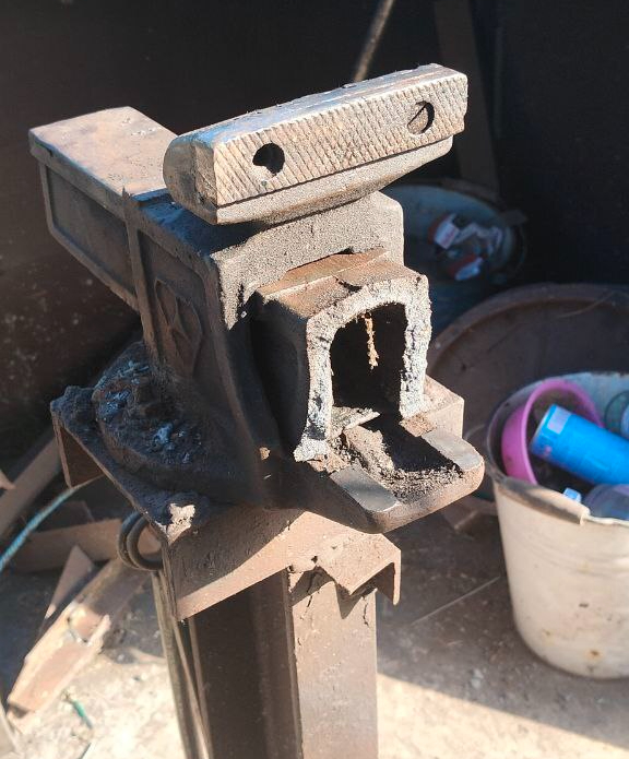 Эти тиски слесарные. Да, они большие, массивные, могут зажать широкую заготовку и держат очень крепко. Но они литые и на самом деле не предназначены для кузнечных операций. Это, кстати, уже вторые тиски в мастерской на моей памяти, потому что этим летом предыдущие решили, что с ними обращались слишком жестоко, и сломались.