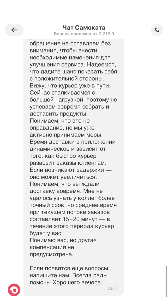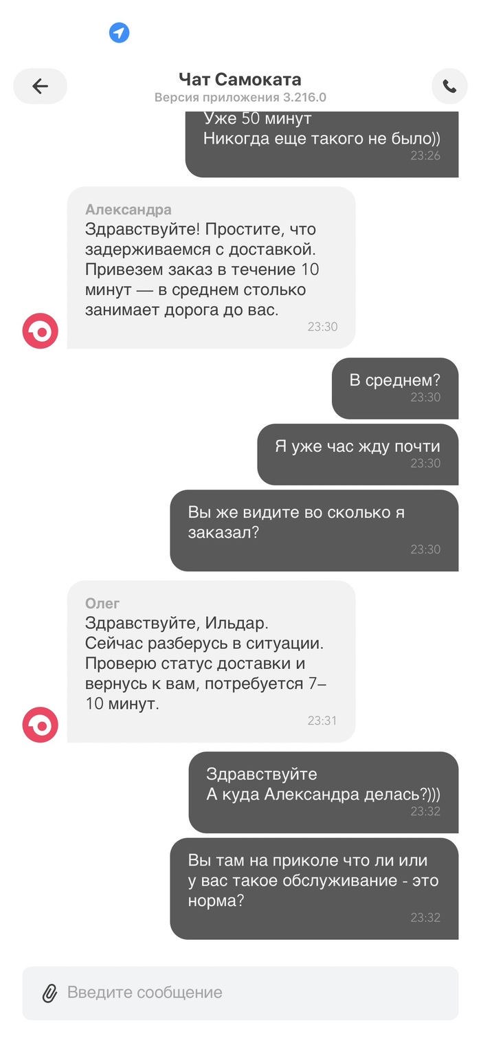Но самое интересное - оператор Александра подключилась, отправила одно сообщение и тут же отключилась, не дождавшись моего ответа (я ответил почти моментально) и потом уже подключается другой оператор Олег. Если для них это нормальный сервис, то для меня, как для человека, работающего непосредственно в развитии клиентского сервиса, это отвратительное отношение к клиенту. Окей, пусть будет Олег. Только когда подключился Олег, мой заказ передали курьеру и пообещали привезти за 7 минут.