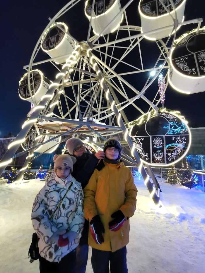 Потом все вместе прокатились на колесе обозрения. Правда, окна там оказались затемненными, и изнутри практически ничего не было видно, поэтому пофотографировать не получилось. Зато отапливаемые кабинки — хоть погрелись)).