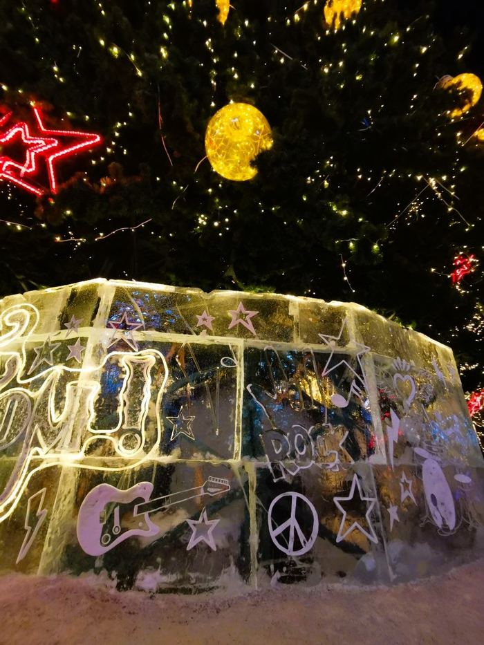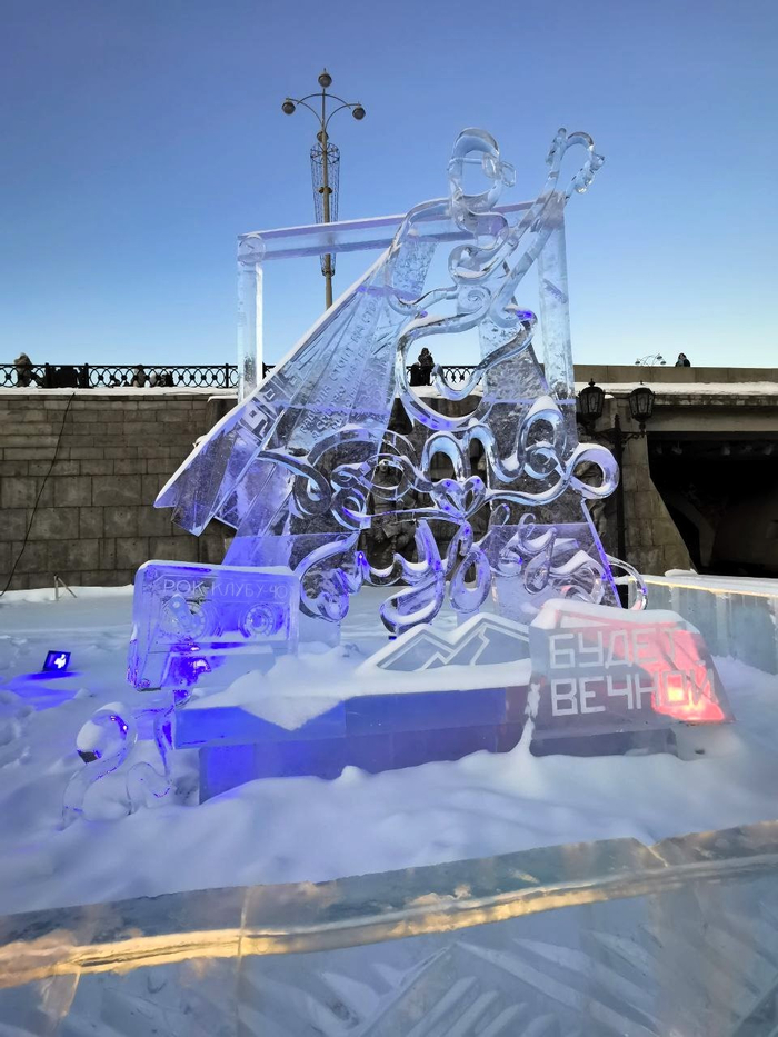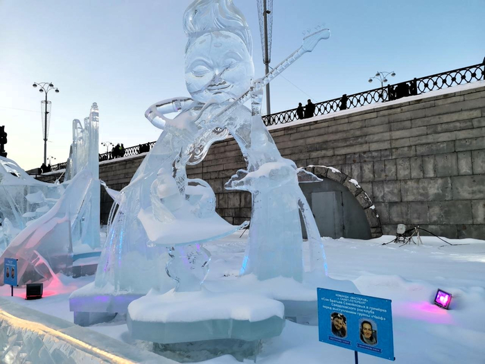 Сразу после входа установлены ледовые скульптуры на тему «рокового направления». Вообще вся тематика городка (увидите далее) будет таковой. Ведь в этом году отмечается сорокалетие Свердловского рок-клуба.