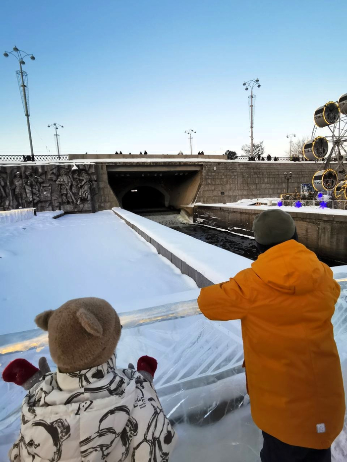 Начать активное времяпрепровождение мы решили с большой горки. Один скат — 150 р. На своих ледянках нельзя, пришлось приобрести их дополнительно тут же. А свои, большие и удобные, взятые из дому, вынуждены были отставить. Жалко. Но всё равно детям было интересно.