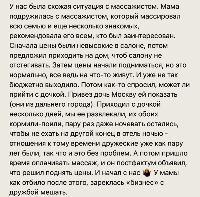 Например, когда мы с мамой были в Китае, один таксист нас очень ловно развёл. Он стал говорить, какие русские хорошие и щедрые, добропорядочные люди. Донёс наши тяжелые чемоданы до ресепшена. А потом стал говорить, что такая нехорошая программа неправильно посчитала ему стоимость заказа и ведь такие хорошие русские не могут обмануть бедного таксиста, который довёз в комфорте и безопасности нас до гостиницы, ещё и чемоданы помог дотащить. Конечно, не можем, мы же
