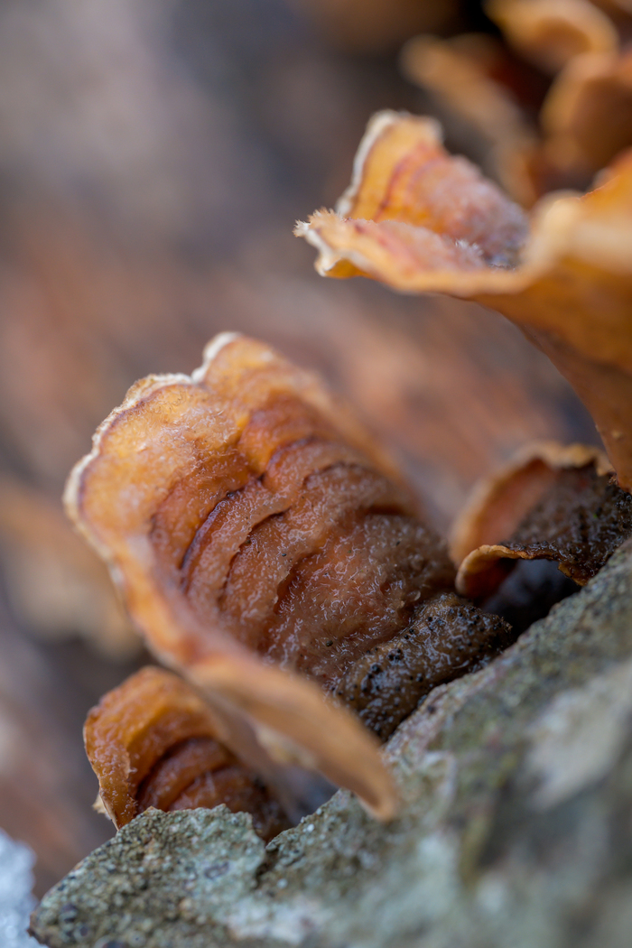 Плодовые тела (то, что на фото оранжевое) достигают 3 мм в высоту и 0,6-0,8 (редко до 1,3) мм в ширину.