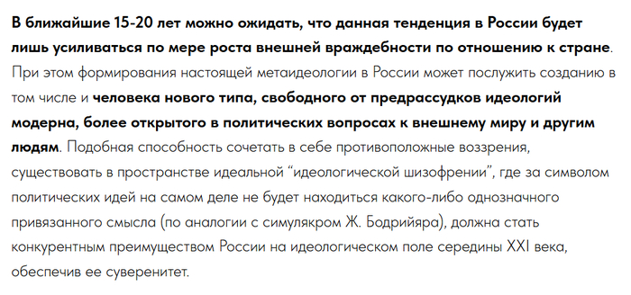 При этом формирования настоящей метаидеологии в России может послужить созданию в том числе и человека нового типа, свободного от предрассудков идеологий модерна, более открытого в политических вопросах к внешнему миру и другим людям. Подобная способность сочетать в себе противоположные воззрения, существовать в пространстве идеальной "идеологической шизофрении", где за символом политических идей на самом деле не будет находиться какого-либо однозначного привязанного смысла (по аналогии с симулякром Ж. Бодрийяра), должна стать конкурентным преимуществом России на идеологическом поле середины XXI века, обеспечив ее суверенитет.