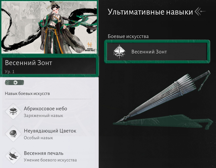 Связанные навыки: «Абрикосовое небо» 🌅 (заряженный навык), «Неувядающий Цветок» 🌺 (особый навык), «Весенняя печаль» 😔 (умение боевого искусства).