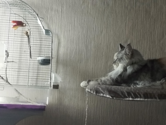 У нас морозы, залетела в приоткрытую форточку синица (меня дома не было). Моя коша - Шкода (почти 7 кг красоты), загоняла, помяла, хвост ободрала. Придется приютить, благо клетка запасная на балконе валялась. У меня еще щегол и канарейка. Так и живем.