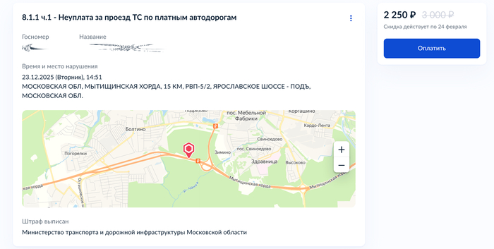 Я конкретно не знаю кому принадлежит МЫТИЩИНСКАЯ ХОРДА, 15 КМ, РВП-5/2, ЯРОСЛАВСКОЕ ШОССЕ - ПОДЪ, МОСКОВСКАЯ ОБЛ, но вижу кто выписал штраф , это Министерство транспорта и дорожной инфраструктуры Московской области, то есть именно в их ведении находится именно эта трасса, и они не могут не знать, что данные по проезду не передаются в Госуслуги, в личные кабинеты банков, не поступают звонки об оплате пользователям, ничего из этого я не получил как уведомление о проезде, то есть налицо разные условия работы платных трасс, считаю что деятельность по сбору оплаты, информированию, всеми собственниками платных трасс, должна быть приведена к единому формату, что бы не возникали ситуации когда информации о необходимости оплаты за проезд нет нигде, кроме сайта этой самой дороги, название которого попадается один раз на какой то опоре над дорогой, местечковых платных дорог появляется все больше и больше , следовательно подобных ситуаций тоже.
