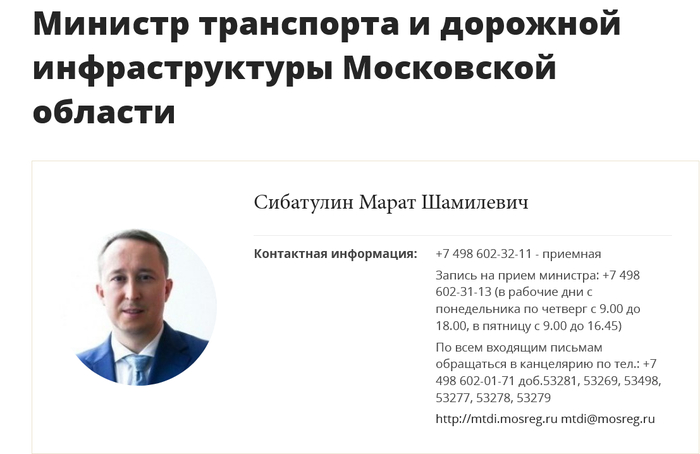 Возглавляет это министерство, Министр транспорта и дорожной инфраструктуры Московской области Сибатулин Марат Шамилевич, попросим его разобраться в ситуации, и заставить надлежащих лиц выстроить систему уведомлений граждан о проезде по платному участку дороги, в соответствии с тем как это делают другие участники рынка платных дорог.
