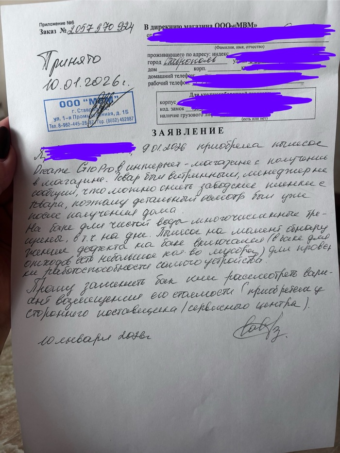 Мне сказали написать заявление и ожидать 10 календарных дней решения. За это время «центральный офис» проверит камеры, посмотрит, как я осматривала пылесос, доставала ли я на стойке этот бак при вручении заказа и, исходя из того, что будет на камерах, будет вынесено решение.