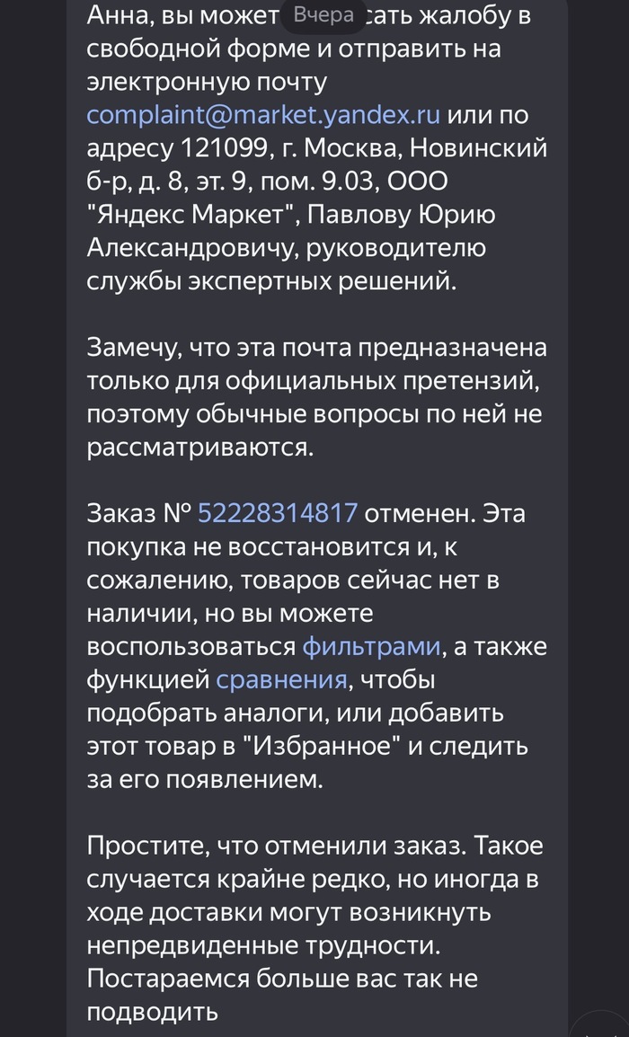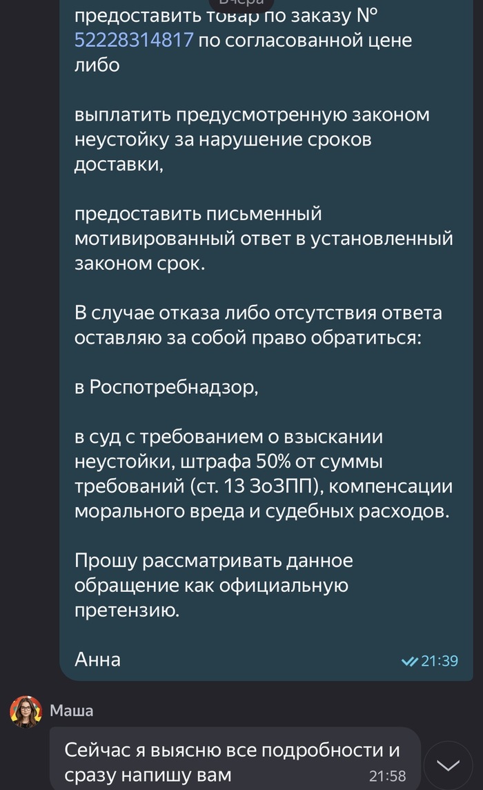Я сразу запросила контакты для направления досудебной претензии, если мои требования не будут удовлетворены. Менеджер ответил, что все контакты есть на сайте.