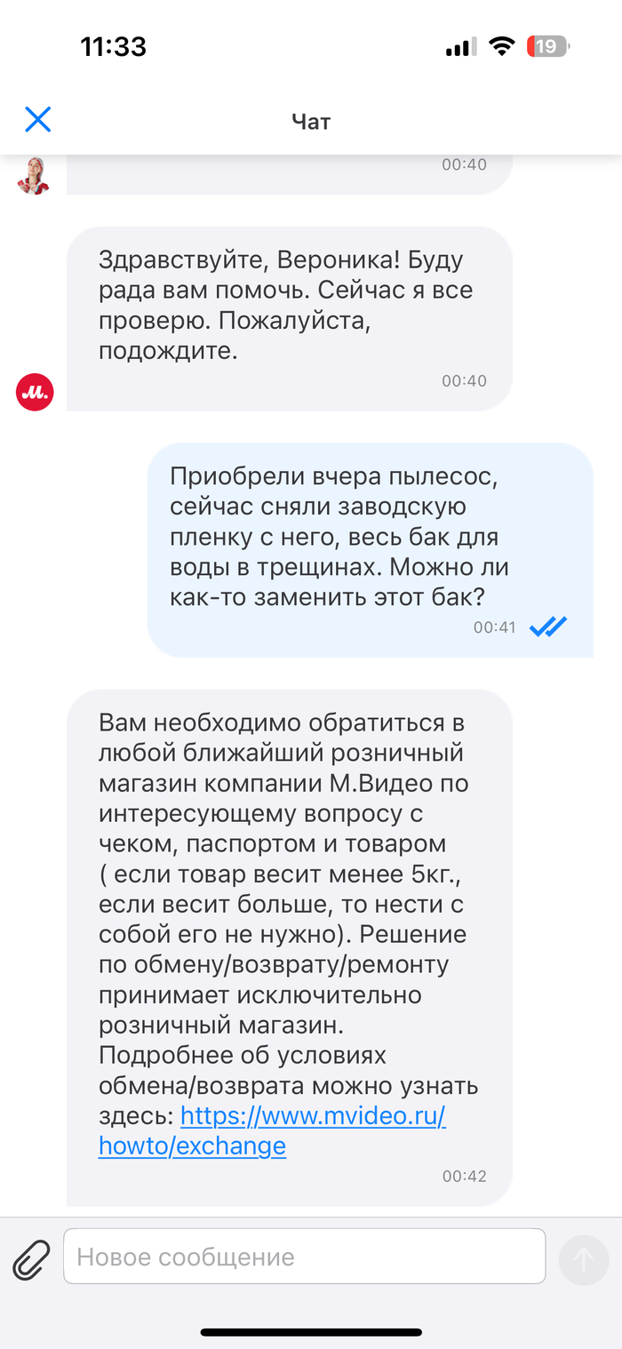 На следующий день (10.01.2026) я обратилась в поддержку мвидео в чате, где мне сказали ехать без пылесоса в любой магазин Мвидео и решать вопрос там.