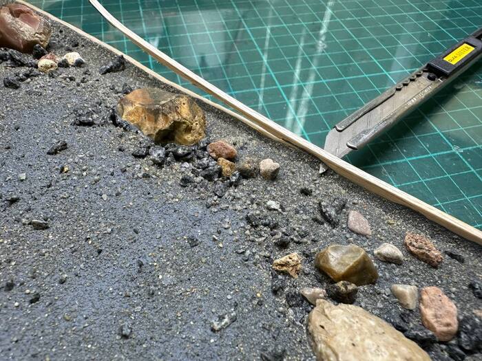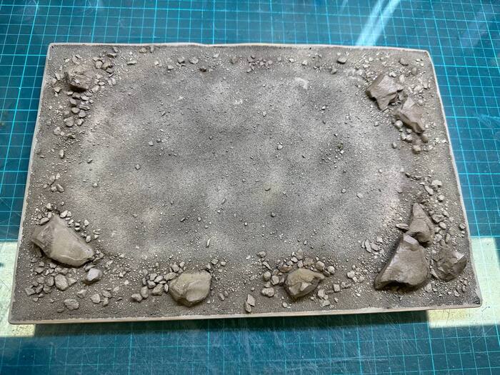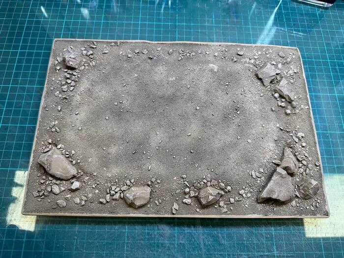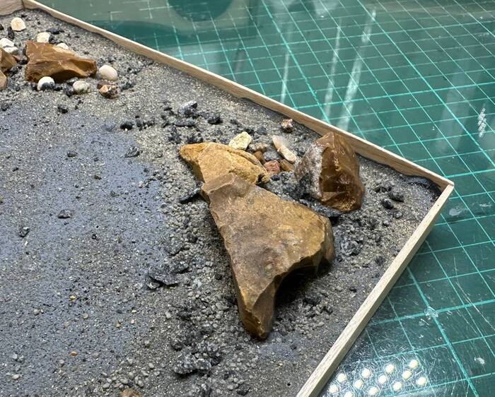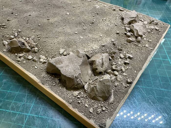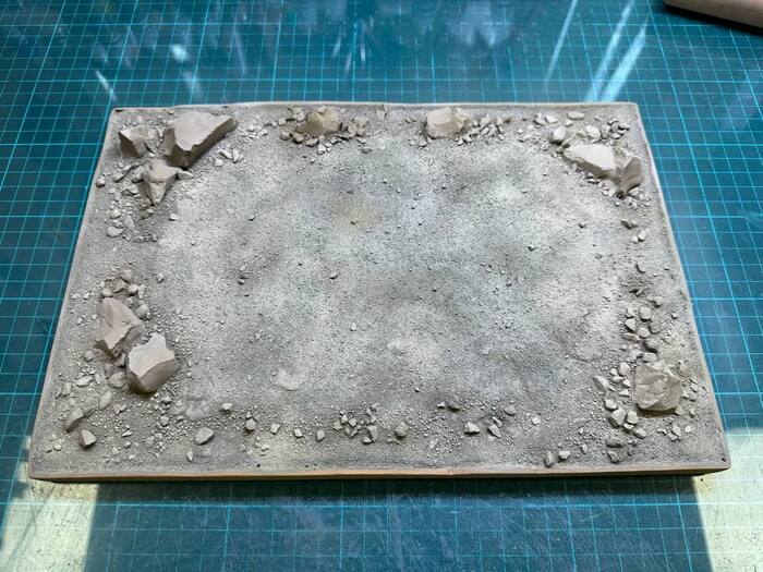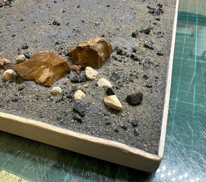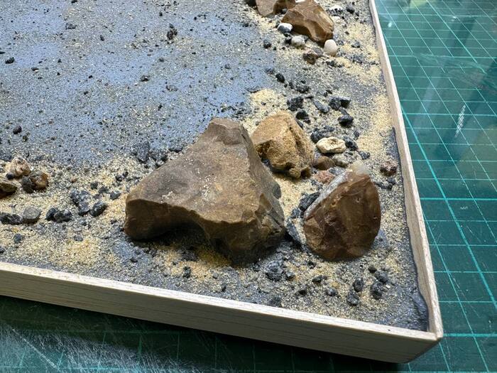 Детализация: Не дожидаясь высыхания пасты, начинаем формировать рельеф. Я использую природные материалы разной фракции: от крупных камней до самого мелкого песка.