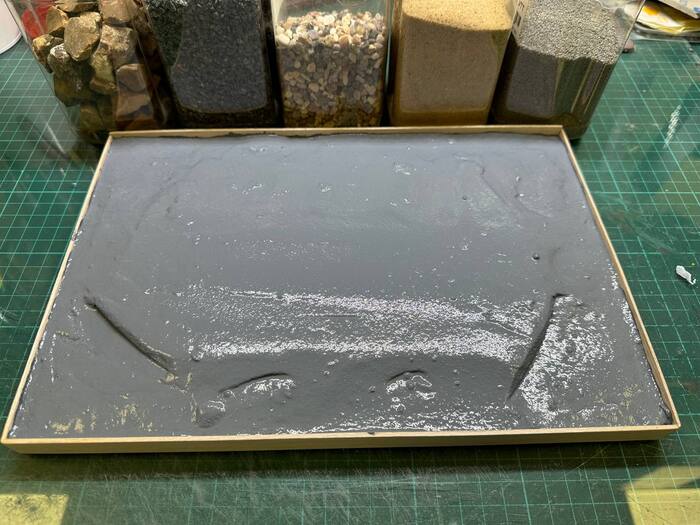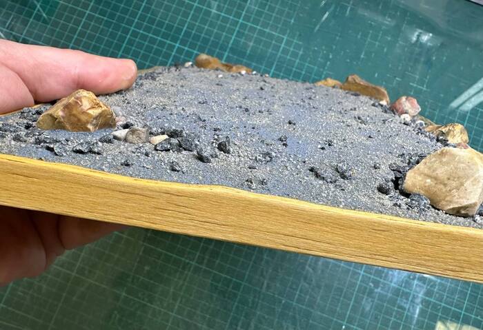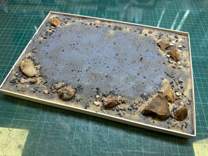 Фиксация: Посыпаем камни и песок прямо на сырую пасту. Они слегка утопают в ней, создавая эффект естественного ландшафта, а не просто лежащих сверху объектов. После полного высыхания паста сработает как клей, и весь декор будет держаться намертво. Оставляем сохнуть и готовимся к следующему этапу!
