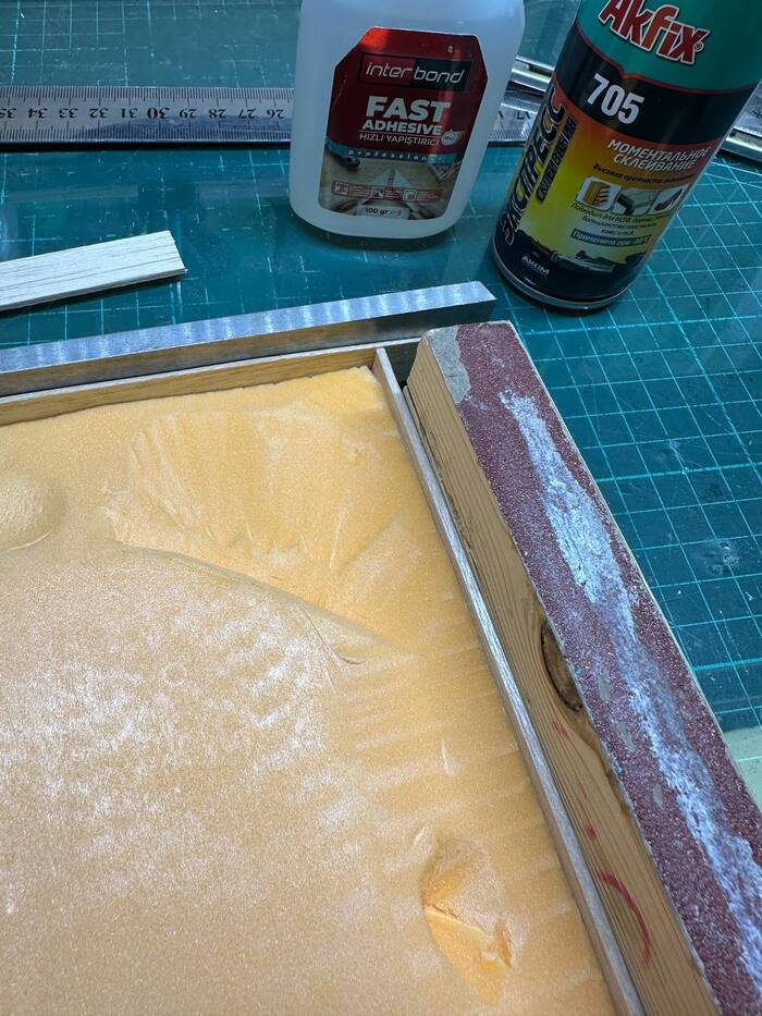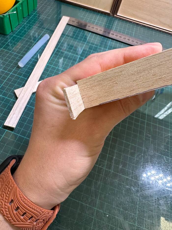 Стыковка углов: Чтобы рамка выглядела аккуратно, на стыках («дерево к дереву») используем густой суперклей — он схватывает моментально и не оставляет потеков.