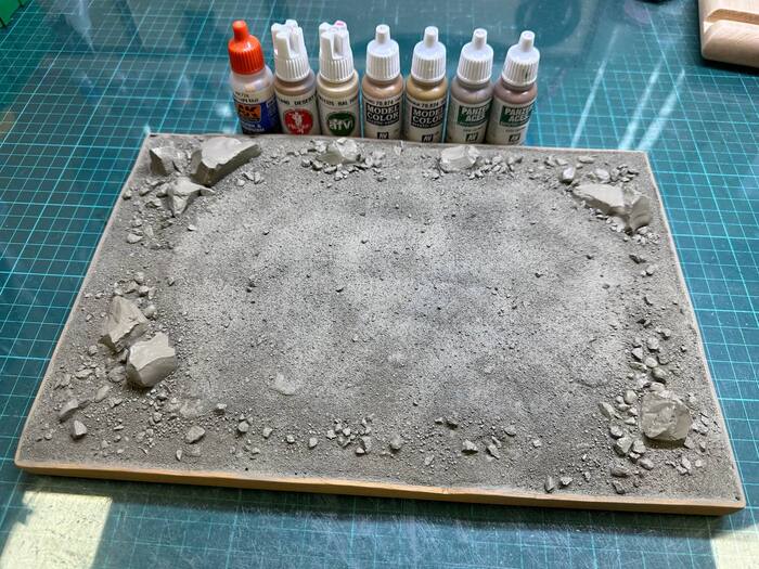 Приступаем к покраске базы. Наша задача — создать реалистичную фактуру камня и земли. Палитра: Используем несколько оттенков светло-коричневого и песочного цветов.