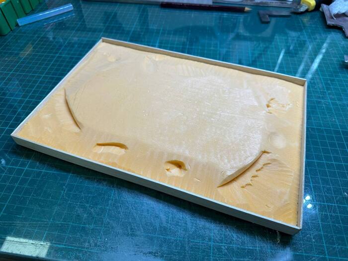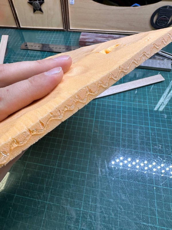 Обработка шпона: Помните высокие бортики, которые мы оставляли, чтобы удерживать текстурную пасту? Теперь, когда всё застыло, аккуратно срезаем лишнее вровень с рельефом. После обрезки обязательно шлифуем края, чтобы они были идеально ровными.