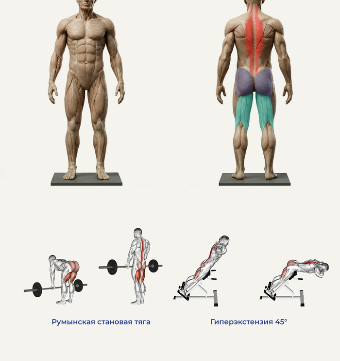 Мышцы: разгибатели спины (на 3D модели их не видно, так как они глубже, идут вдоль позвоночника), большие ягодичные мышцы, бицепсы бедер (задняя поверхность бедра).
