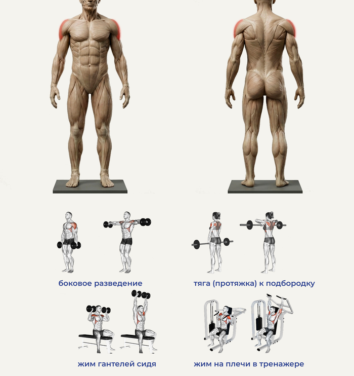 Любое движение, где руки (и в особенности часть от плеча до локтя) расходятся в стороны, будут задействовать средние пучки дельт. Боковые разводки с гантелями, в кроссовере (тренажер буквой П и тросовой тягой), жимы над головой (армейский жим, жим гантелей сидя/стоя).