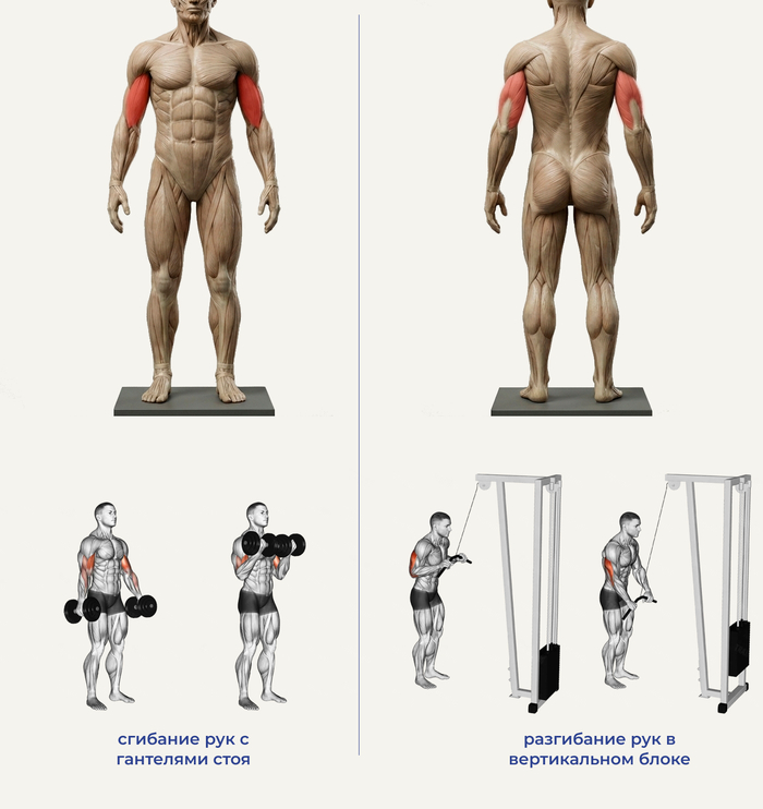 На всякий случай добавлю, что сгибание рук тренирует бицепсы, а разгибание рук, тренирует трицепсы.