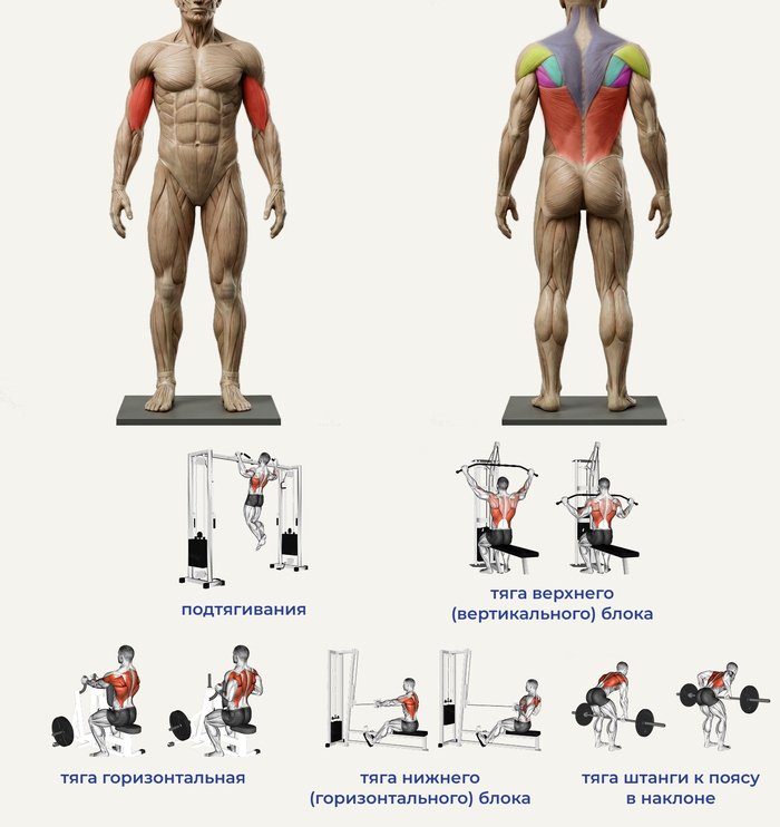 Мышцы: широчайшие мышцы спины, трапециевидные мышцы, задние пучки дельт, большие и малые круглые, бицепсы рук.
