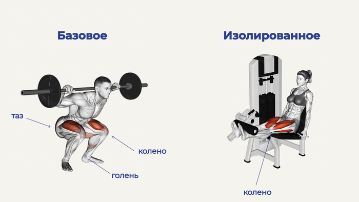 Базовые упражнения — это любые упражнения, которые задействуют два и более суставов в работе. Например, приседания со штангой — это базовое упражнение, потому что здесь работает тазобедренный сустав, коленный и голеностопный сустав. В то время как разгибание ног в тренажере будет являться изолирующим упражнением, потому что задействует только коленный сустав.