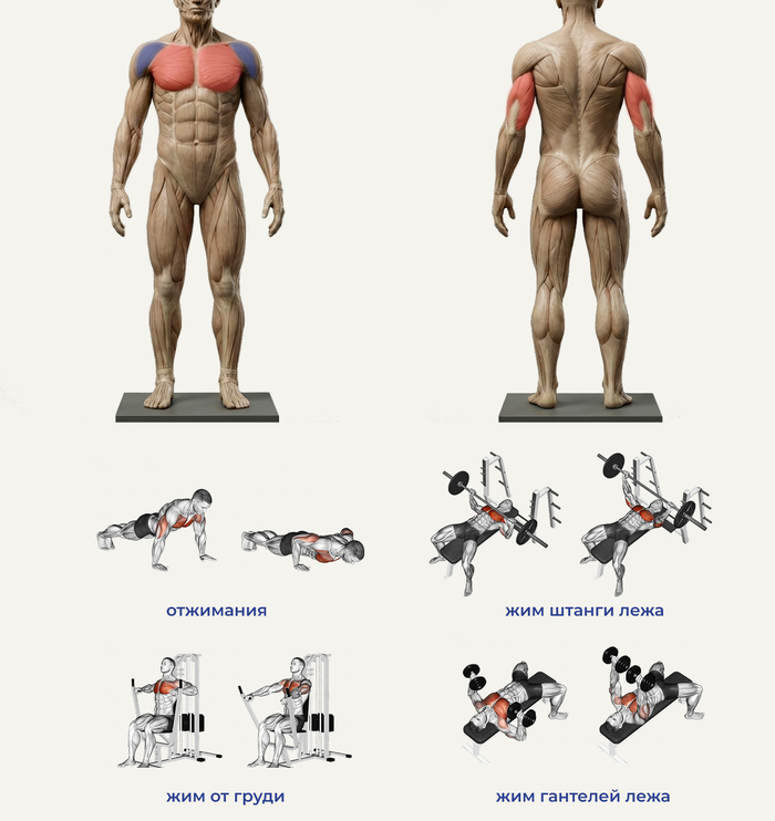 Мышцы: грудные мышцы, передние пучки дельт, трицепсы рук.