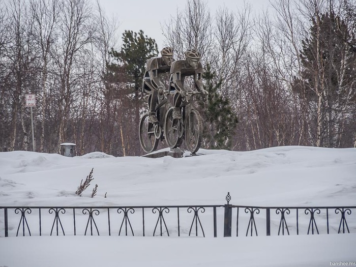 Само здание аэровокзала выполнено в виде чума (точнее чумов), но их красот понравилось не это, а вьездная стела. Немного пробуксовав в крепком снегу, я добежал до памятного знака и пофоткал. В принципе, к 3 часам уже вновь стемнело. Как только остановился - почувствовал, что в городе было ощутимо теплее, а в открытом поле мороз клеил все слои одежды друг к другу.