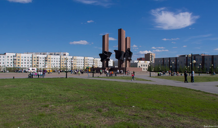 Стела «Новый Уренгой», один из символов города. Вроде как когда-то располагалась на краю города, но сейчас находится практически в центре. Хоть и чуть в сторонке от жилой зоны.