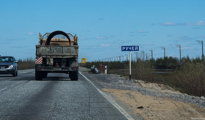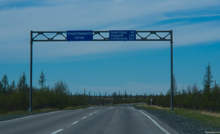 Дорога на запад, к областному центру. В 2014 там были только зимники, сейчас же от Надыма до Салехарда уже круглогодичная трасса есть. ЖД ещё нет и, похоже, не скоро будет, СШХ официально был положен на полку.