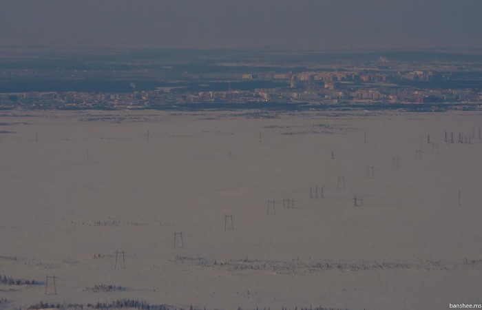 Вдали в тундре можно увидеть копер сверхглубокой скважины (СГ-6, по-моему). Помельче кольской, но 7,5 километров — тоже неплохо.