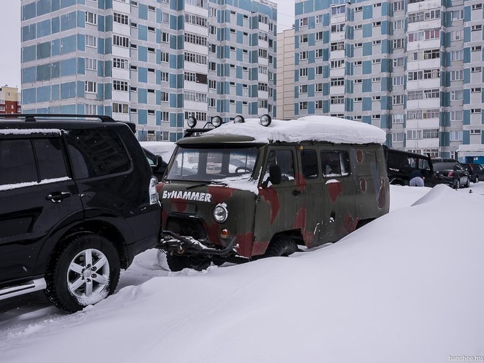 Пока добирался обратно в город, то пытался сформулировать ответ, заданный диалектическим единством и противоречием высоких зарплат и суровой природы. Например, какие автомобили можно увидеть тут? То, что дорогое или то, что проходимое? С одной стороны, высокий клиренс и полный привод как будто напрашивается сам собой, с другой - до города ведёт федеральная трасса. Подходя со своих дилетантских позиций (я охладел к авто после того, как забросил просмотр Асафьева), то скажу, что какого-то превалирования конкретного класса автомобилей здесь нет. Много кроссоверов, но много - и седанов. Если сравнивать с другими городами, то автопарк похож на крупный город или миллионник, но не столицы: маловато совсем "жира" (видел лишь Гелендваген), но и отечественного почти ничего нет (3-4 Нивы-Шнивы не в счёт). Китайцев достаточно, но не самых массовых, почти все - кроссоверы. Удивило обилие пикапов. Всякие тундры, хайлюксы, л200, рам 1500 и даже УАЗ. Но стоит отдать должное - электричек не заметил :)