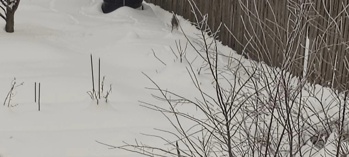 Заяц спрятался в снежной меже,