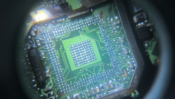 Поэтому выпаиваем процессор, ставим слетевшую мелочуху на место и снимаем лишний припой оплёткой. Берём лупу и... видим корень всех проблем поздних Сименсов - отлетевшие пятаки!