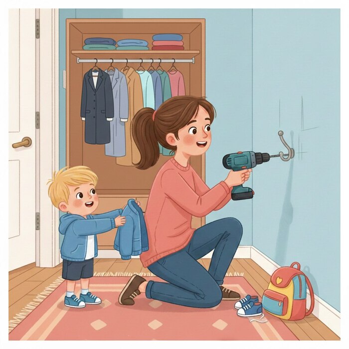 Замечали, что в саду ребёнок, который дома «не умеет», вдруг сам справляется с курткой и ботинками? Всё просто: среда в саду сделана для него. Крючок — на его уровне, полка — под его рукой, для каждой вещи — своё ясное место. Дома же чаще всего всё приспособлено под взрослых. И выходит, что мы сами, того не желая, отказываем ребёнку в праве на подражание нам. Как он может повторить наш чёткий ритуал «пришёл – развесил – поставил», если все крючки у него над головой?