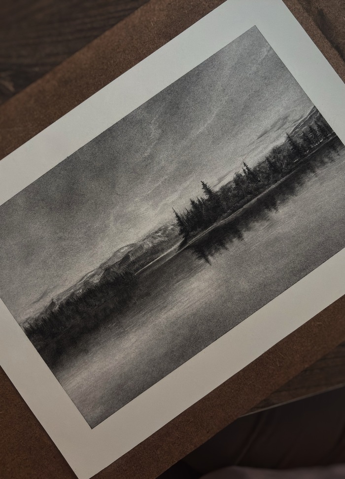 Этот пейзаж был сделан на заказ, но, так как заказчики — мои хорошие друзья, исполнителю было предоставлено чуть больше свободы😄 Так, где-то «сочинились» дополнительные елки для уравновешивания темных и светлых зон. Слева должен был быть кусочек берега и свисающие ветви, но творческие тараканы единогласно постановили, что не стоит ограничивать лишними элементами «полетность» взора. И как будто я уже сама там была, и будто свой спиннинг там забрасывала, и тащила трехкилограммовую щуку..