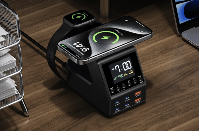 Наличие дисплея отображает время и параметры работы, а встроенный будильник расширяет функциональность для рабочего стола. Беспроводная быстрая зарядка снижает количество кабелей. Такая станция подходит пользователям с большим количеством техники и потребностью в централизованном питании.