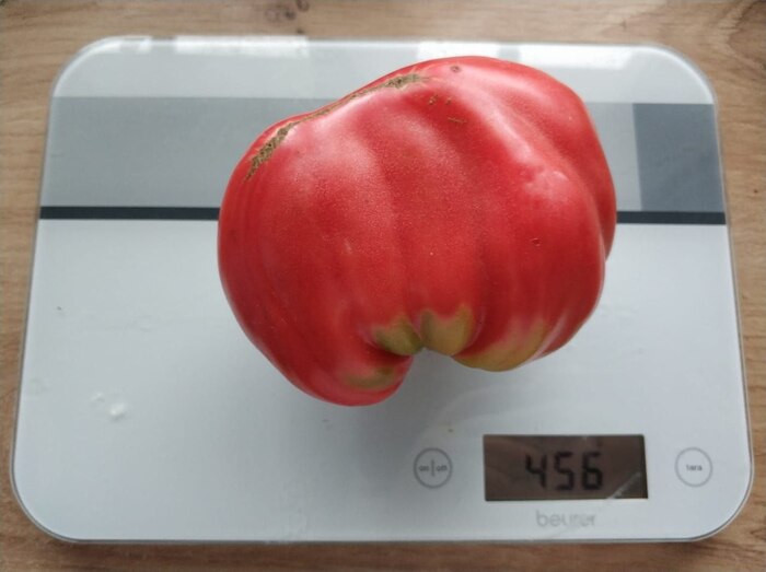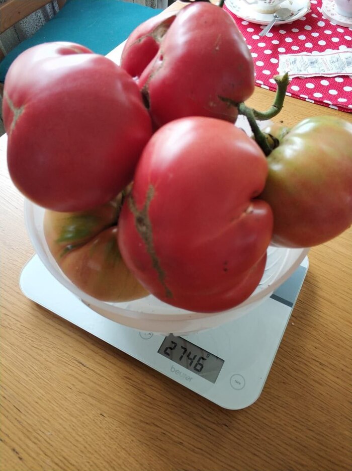 Воловье сердце. Вес в среднем 500-700 грамм. Вяжут хорошие кисти по 4-5 томатов. Чем выше, тем мельче. Больше 4 кистей, к сожалению, мне собрать не удавалось.