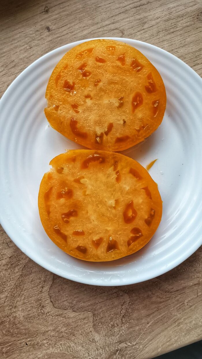 Сокровище инков и канадское наследие (по теории заговора, это одно и то же) - томат биколор, один из самых ранних крупноплодов. Оранжевый с розовым кончиком и сердцевиной - на мой взгляд это скорее среднеплодный томат. Вес крупнячков - 400-500 грамм. Вкус сладкий, с каким-то даже фруктовым вкусом.
