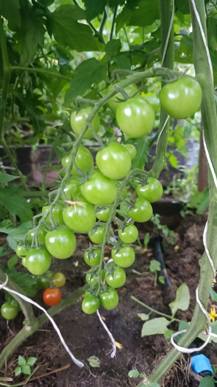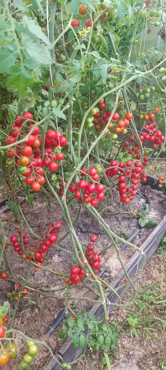 Мальвина - Очень красивый томат. Если бы не был индетерминантом, его отлично можно было бы выращивать дома. Короткие междоузлия, не очень крупные ягоды, но крепкие небольшие кисти - как веер и все усыпаны черриками. Выглядит прямо как новогодняя ёлка вся в красных шариках. Веду в несколько стволов, отлично вытягивает весь урожай. Но самое главное вкус - из красных он однозначно самый сладкий. Немного уступает Краскам и доктору Фросту. Но слаще Барри.