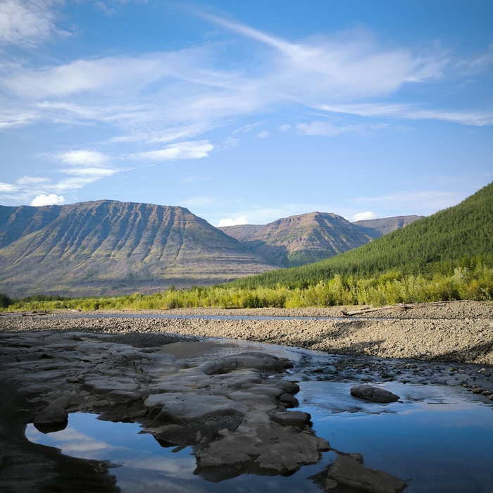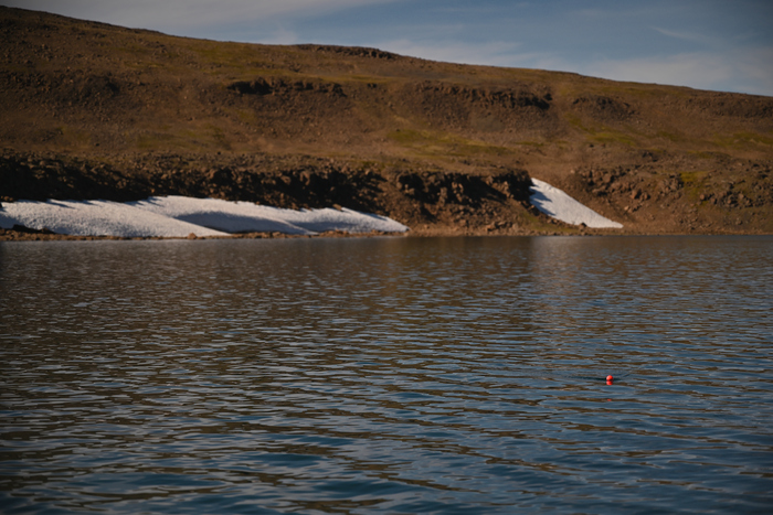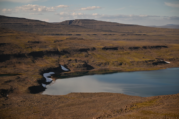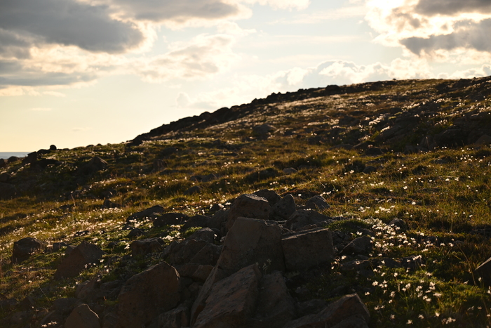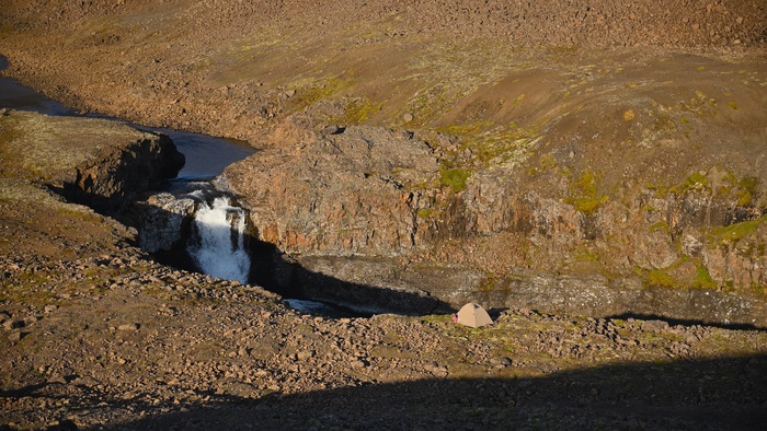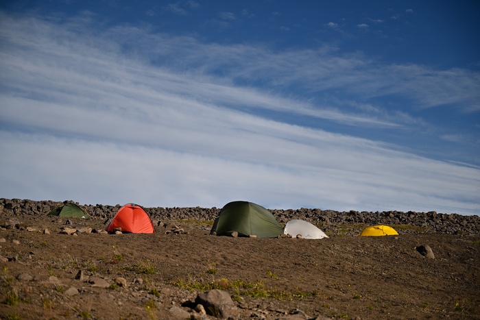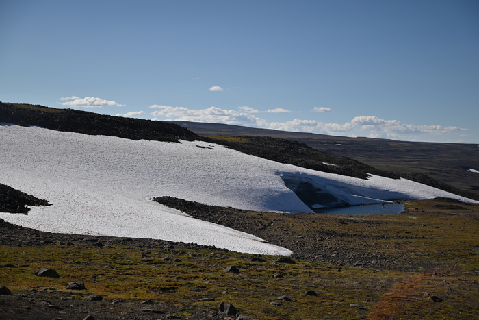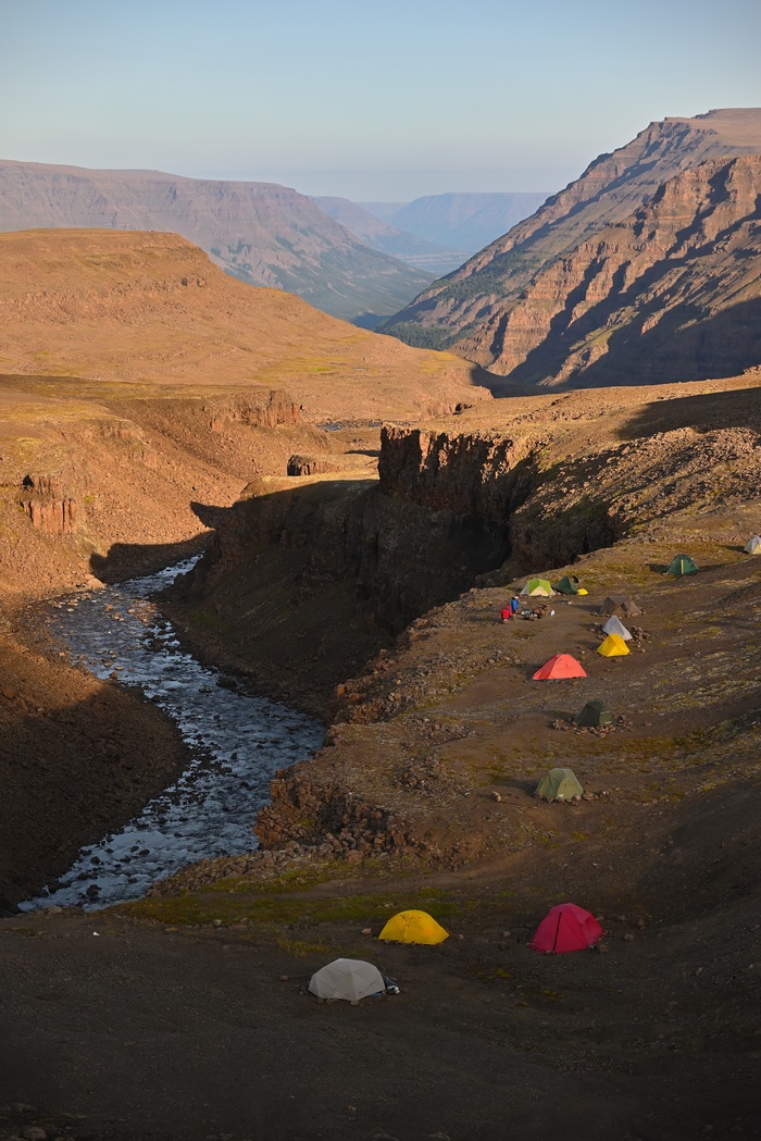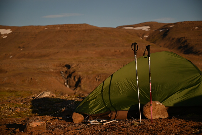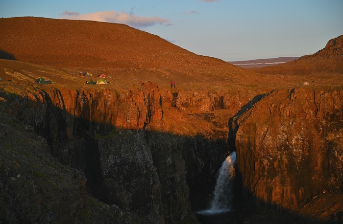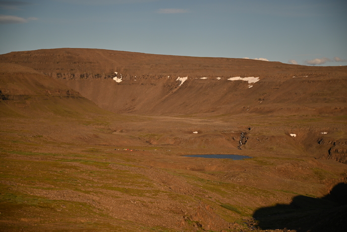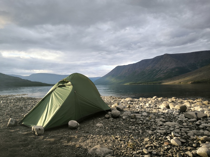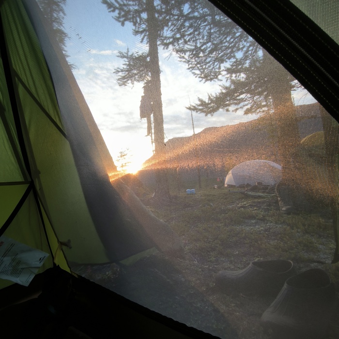 День 7: утро выгоняет из палатки солнечным жаром и духотой ещё до 7 часов. Хотя полярный день уже уходит, и небольшие горы рядом со стоянкой по началу прикрывают от солнца, большую часть времени спастись от него всё равно негде.