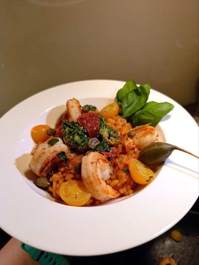 - Креветки, рис, помидорки чери, лук, брокколи (у меня была замороженная-разморозил), чеснок, каперсы, вяленые томаты, сладкая паприка, шафран, базилик.