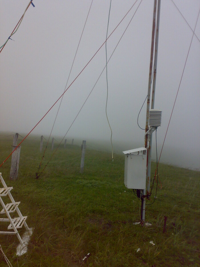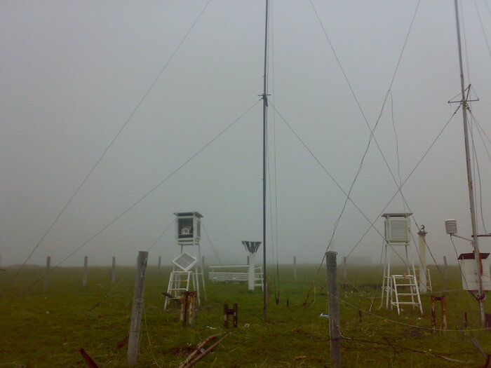 В белом "грибке" спрятан датчик температуры и влажности (hmp155), датчик ветра на верху мачты, почвенный термометр на земле, барометр в служебке.