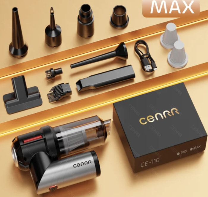 Мощный Беспроводной Автомобильный Пылесос CENRR 998000 PA рассчитан на уборку салона, багажника и труднодоступных зон между сиденьями.