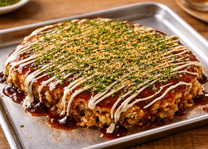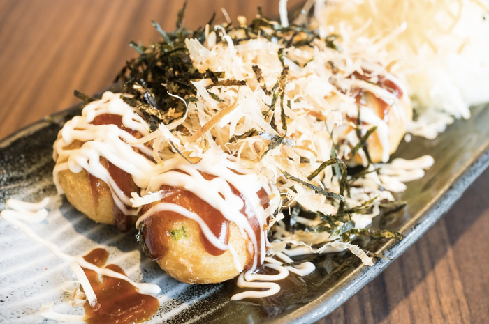 Японское блюдо в виде шариков из жидкого теста с кусочками вареного осьминога, зеленым луком, тэнкасу — жареной тестообразной крошкой, маринованным имбирем и другими добавками.