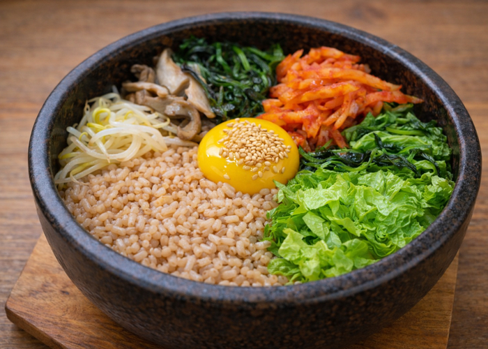 Корейское блюдо готовят из отварного белого риса, на который выкладывают овощной салат намуль, острую перцовую пасту кочхуджан, тонкие ломтики говядины, а сверху — сырое яйцо или яичницу. Подают в горячем каменном горшочке тольсот или другой глубокой посуде, где овощи располагают по цветам с яйцом в центре.